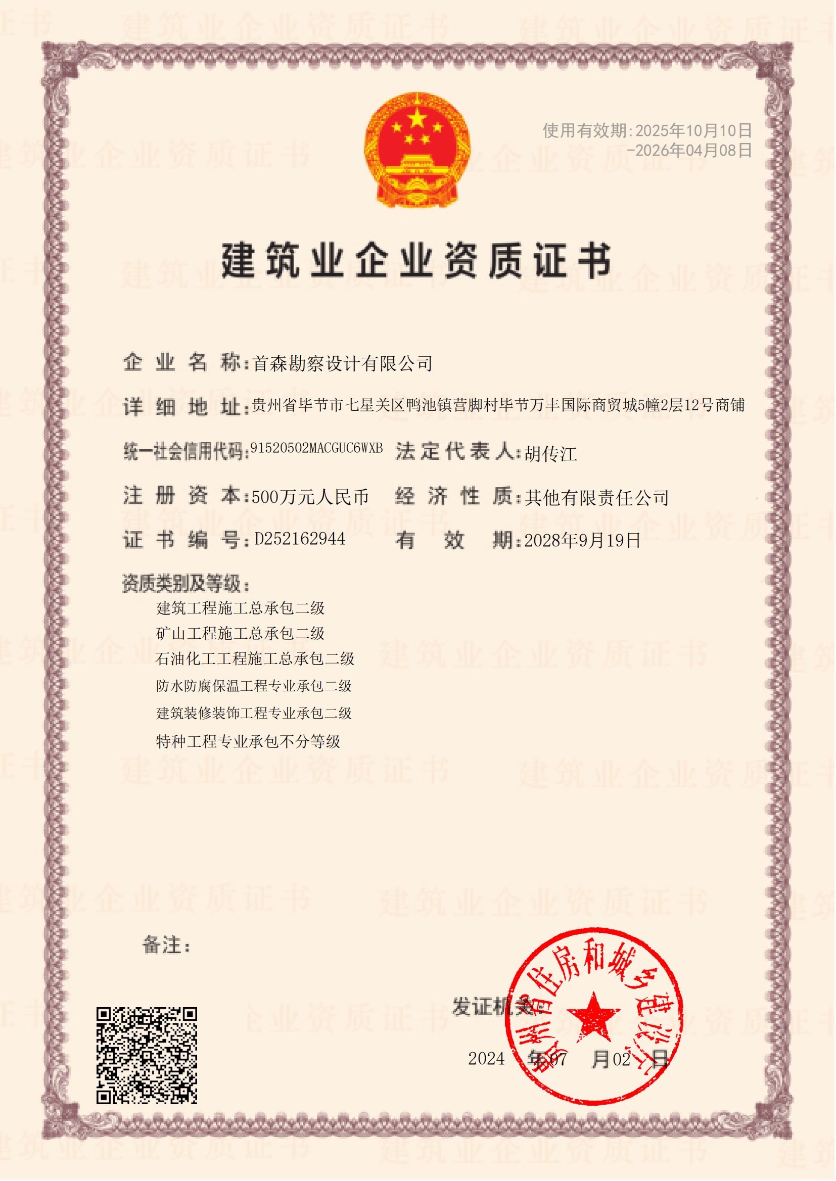 建筑工程施工总承包二级、矿山工程施工总承包二级、石油化工工程施工总承包二级、防水防腐保温工程专业承包二级、建筑装修装饰工程专业承包二级、特种工程专业承包资质不分等级